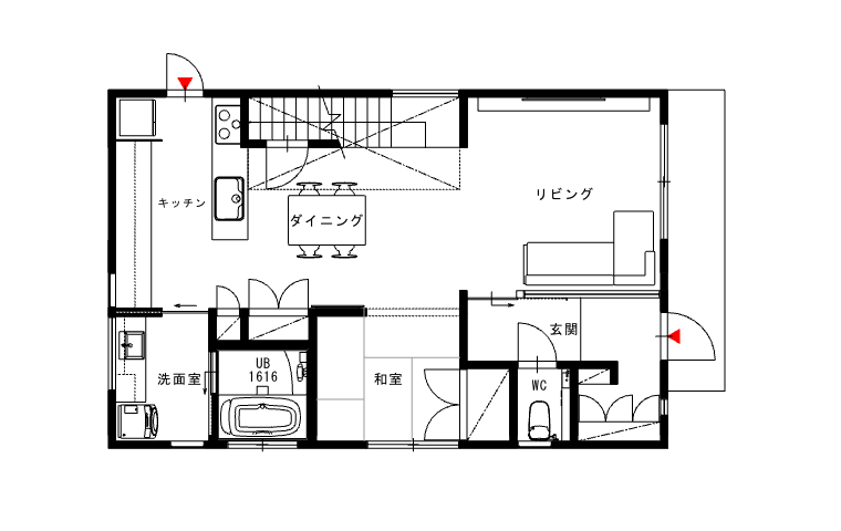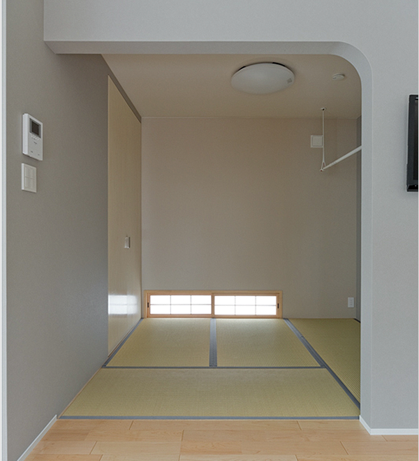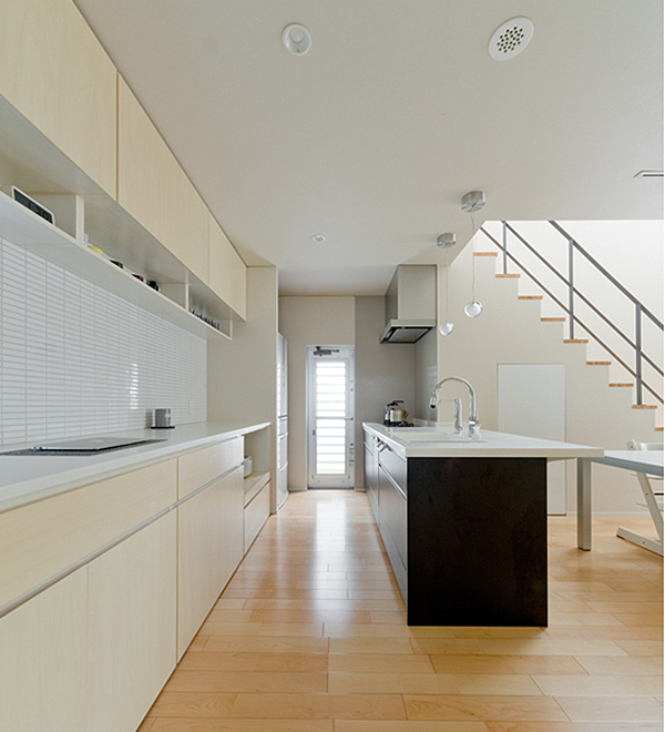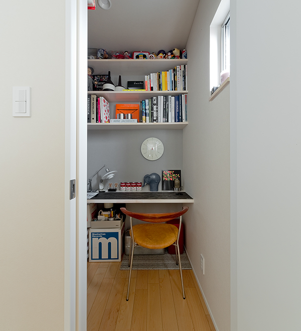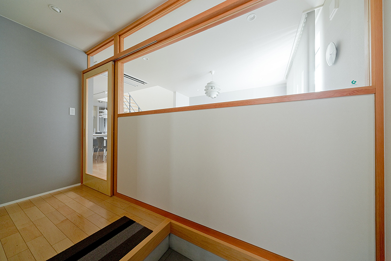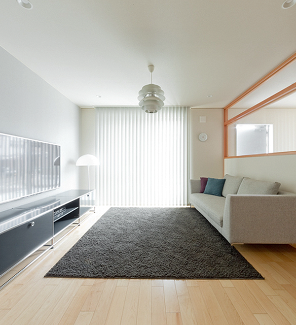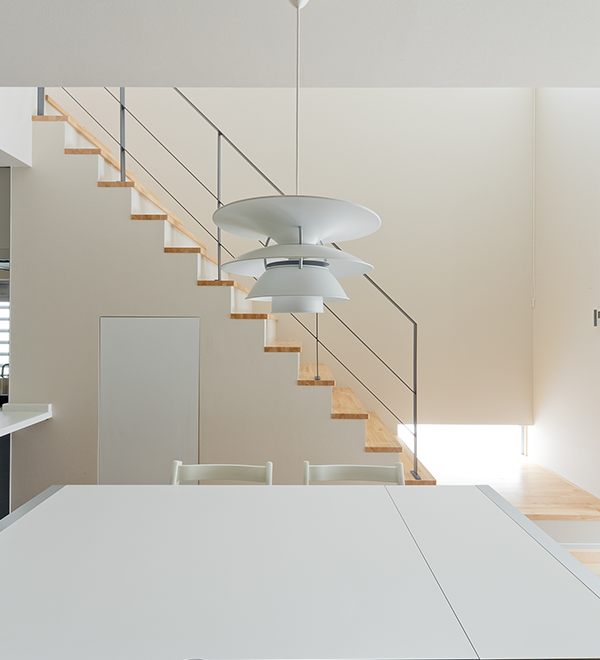 スカンジナビアンスタイルのインテリアが優しく馴染む色彩と細部の仕上げにこだわったモダンな住まいです。外観はガルバリウム鋼板に覆われた四角いデザイン。ダクトや配線の隠し方を工夫し、すっきりとした見た目を追求しました。玄関は木枠のサッシとスケルトンの建具を介してLDKと繋がる設計に。目線が抜け、光を共有できるため、狭さを感じません。LDKはオープンなキッチンとリビング階段、畳スペースを備えたワンフロア。